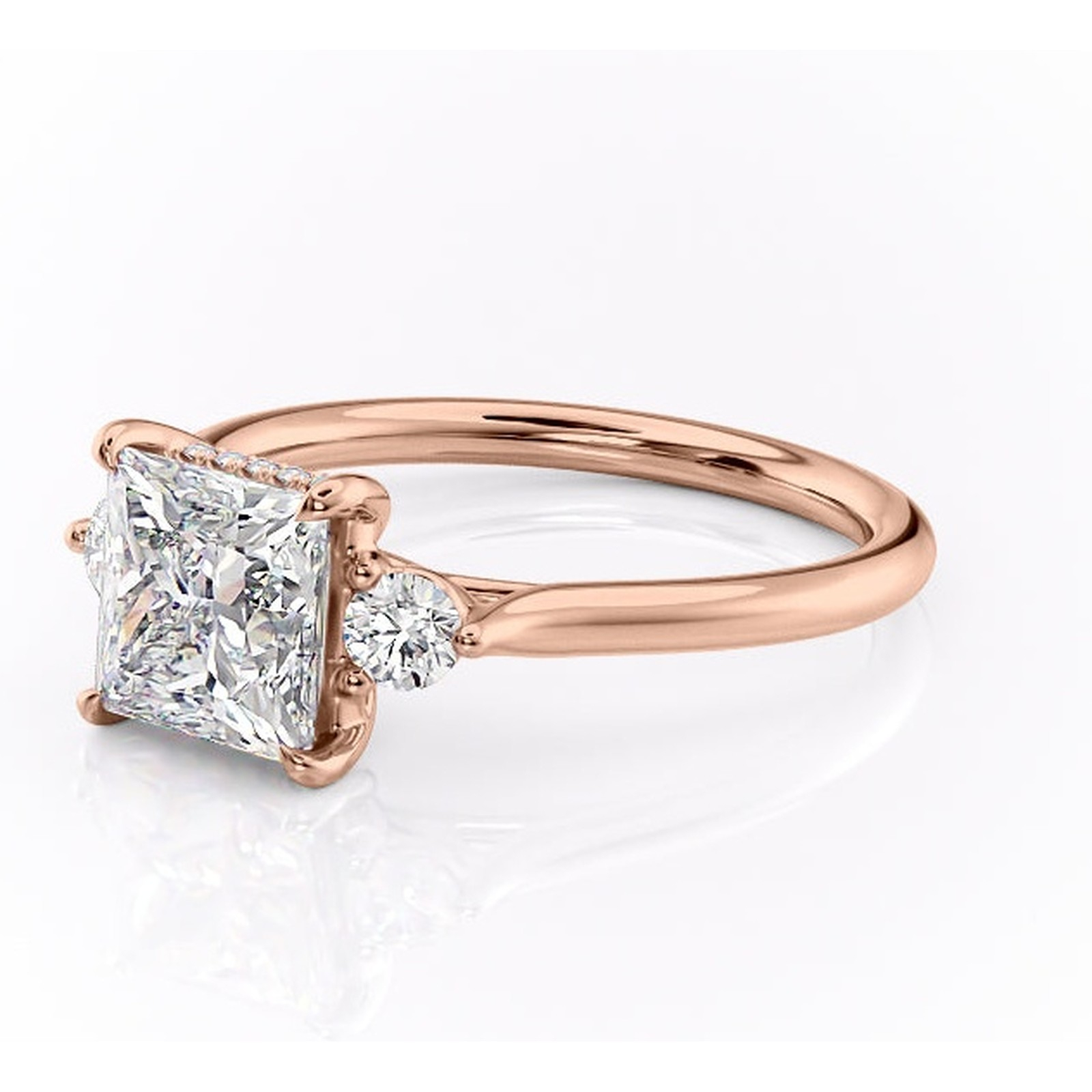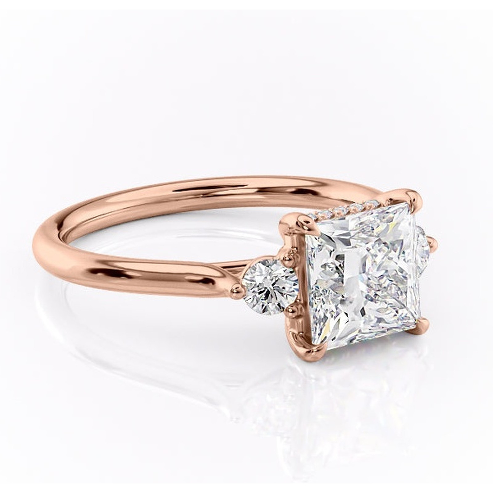 Inel de logodnă Delphine din aur Rose 18kt cu moissanite tăietură princess – Montură cu trei pietre rafinată pentru profil mediu | Personalizează și configurează gratuit online