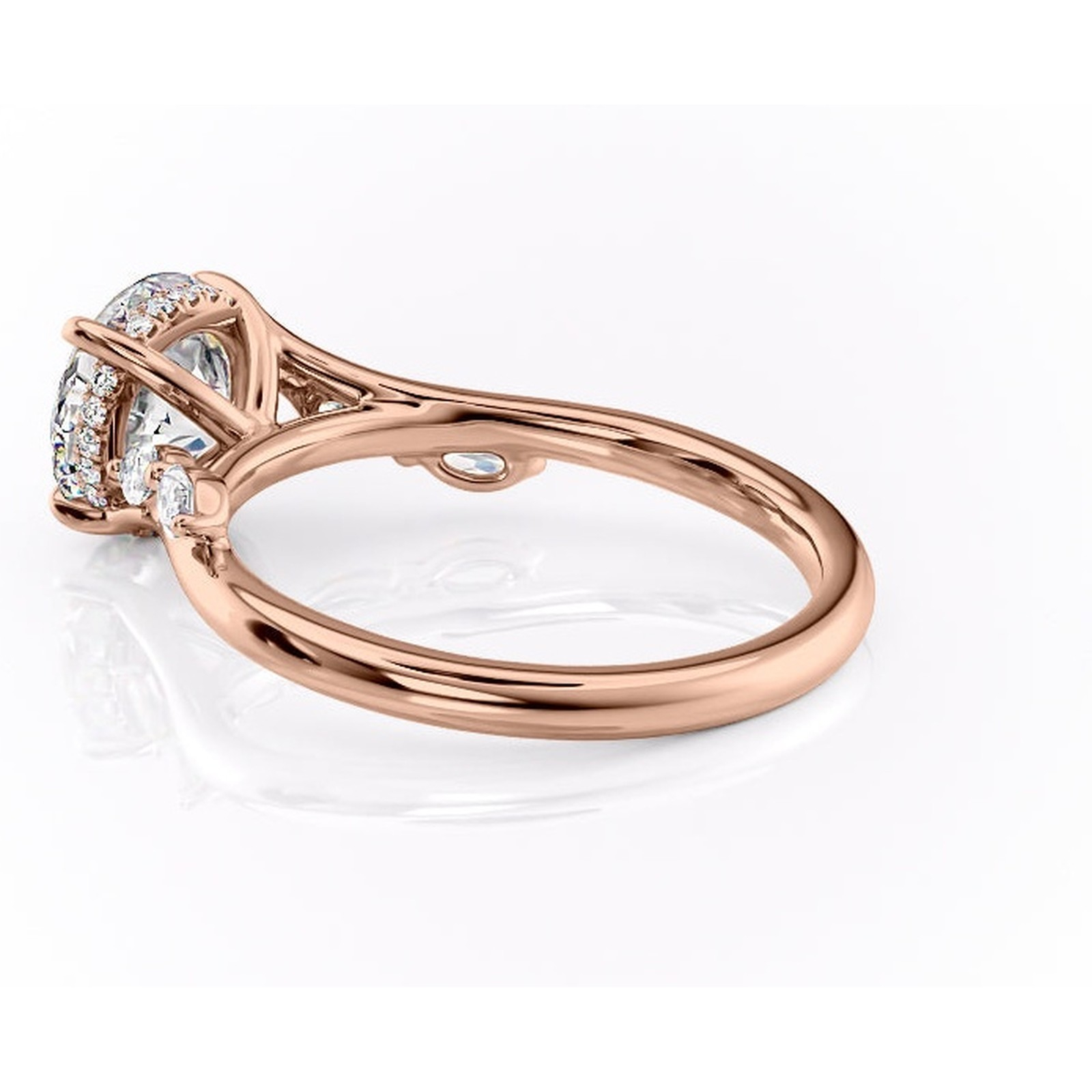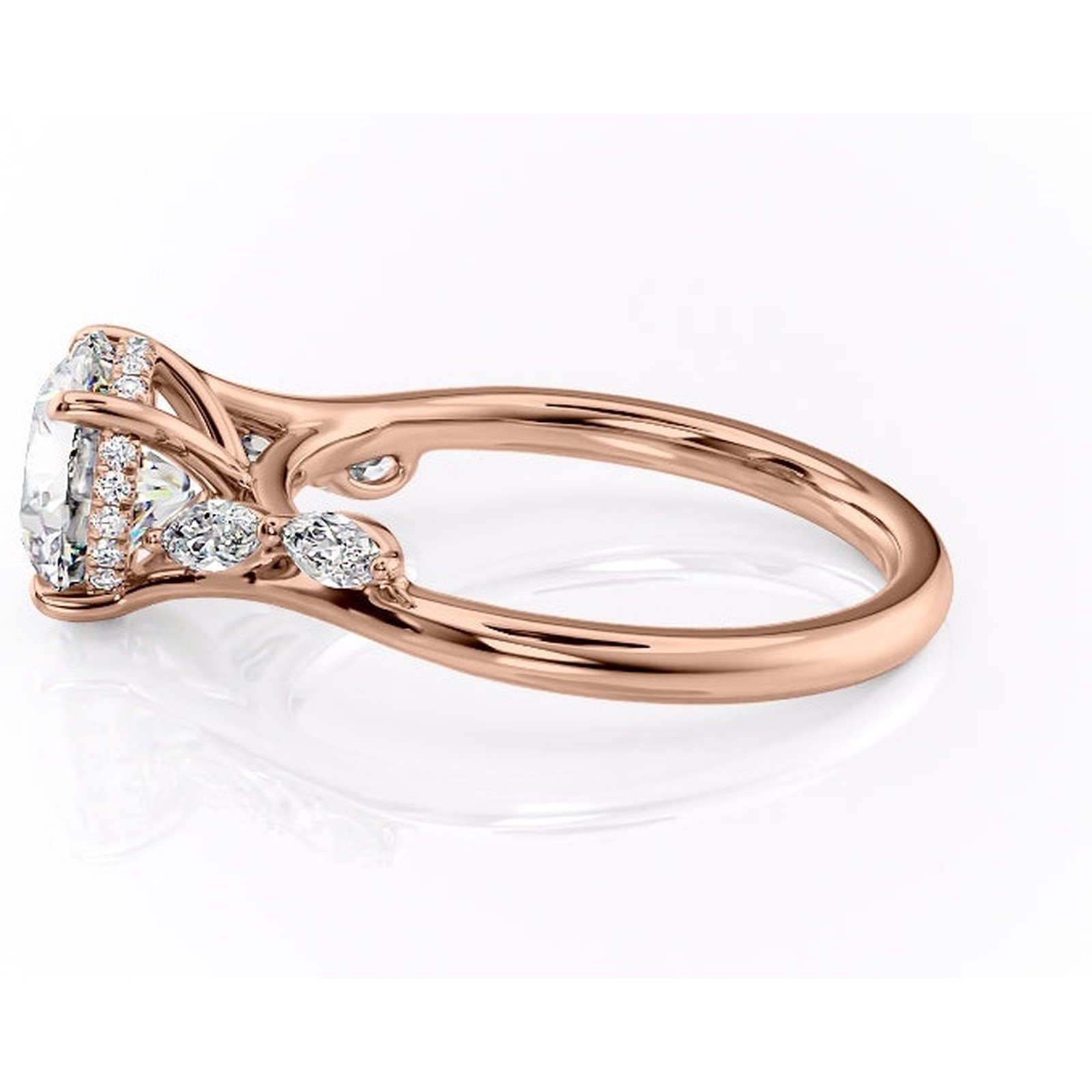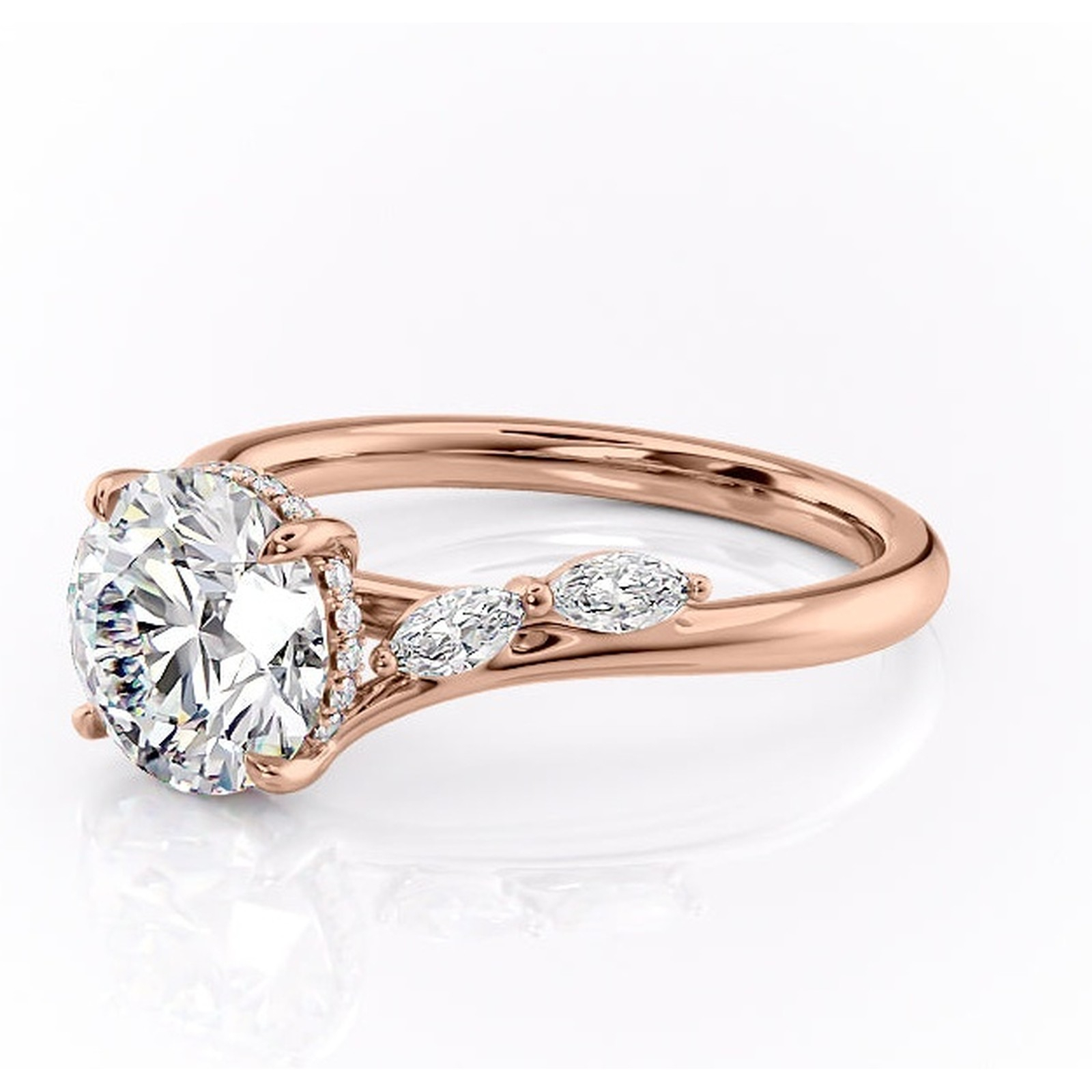 Inel de logodnă Faelynn din aur Rose 14kt cu moissanite tăietură rotundă – Pietre laterale rafinată pentru profil înalt | Personalizează și configurează gratuit online