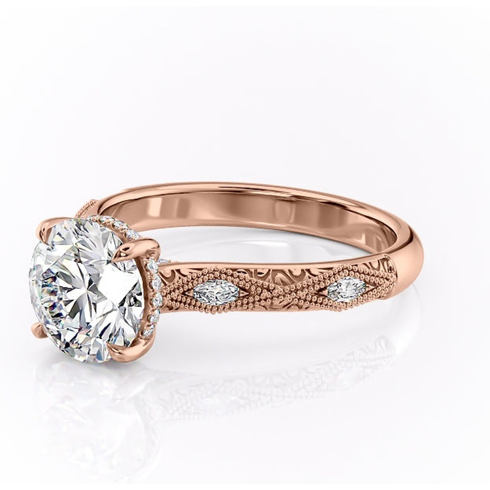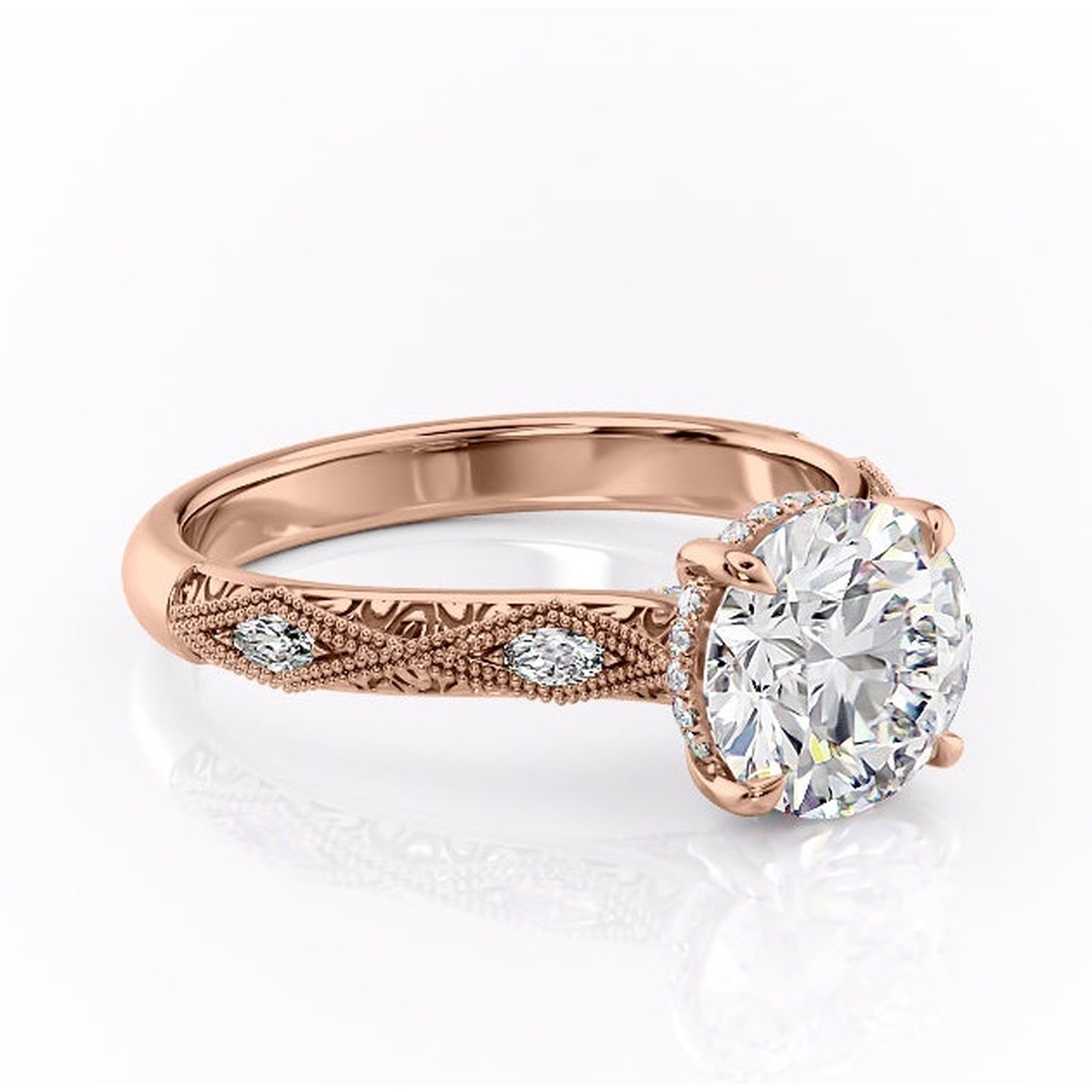 Inel de logodnă Vespera din aur Rose 14kt cu moissanite tăietură rotundă – Pietre laterale rafinată pentru profil înalt | Personalizează și configurează gratuit online