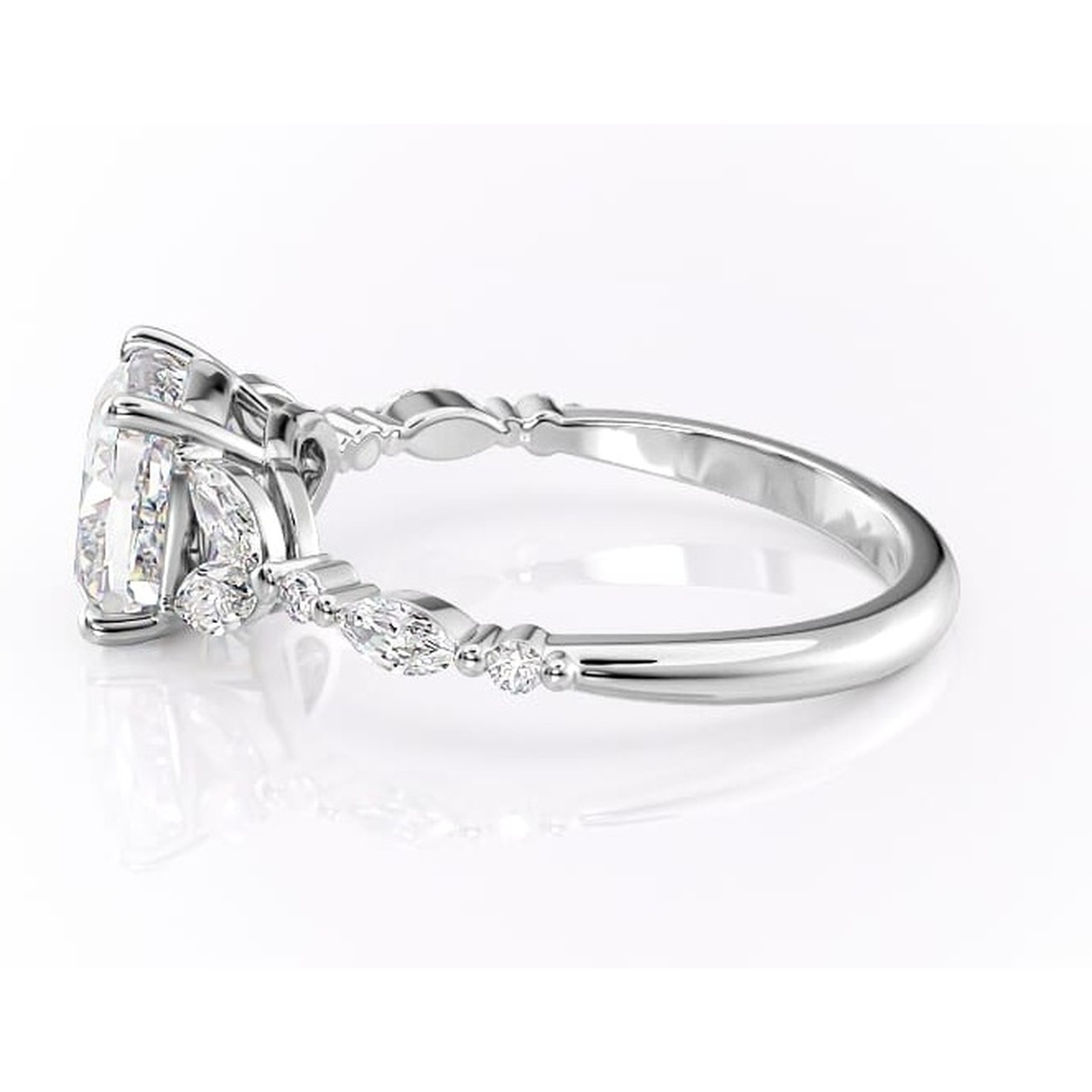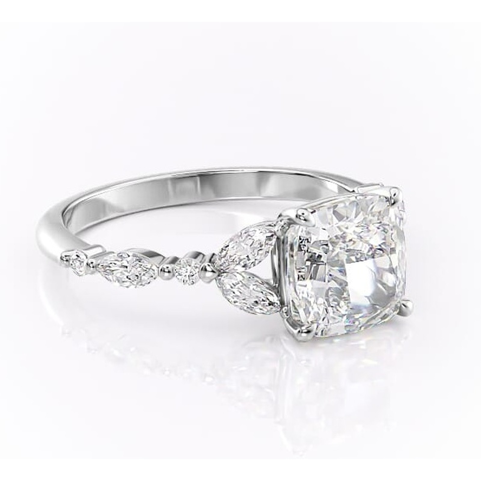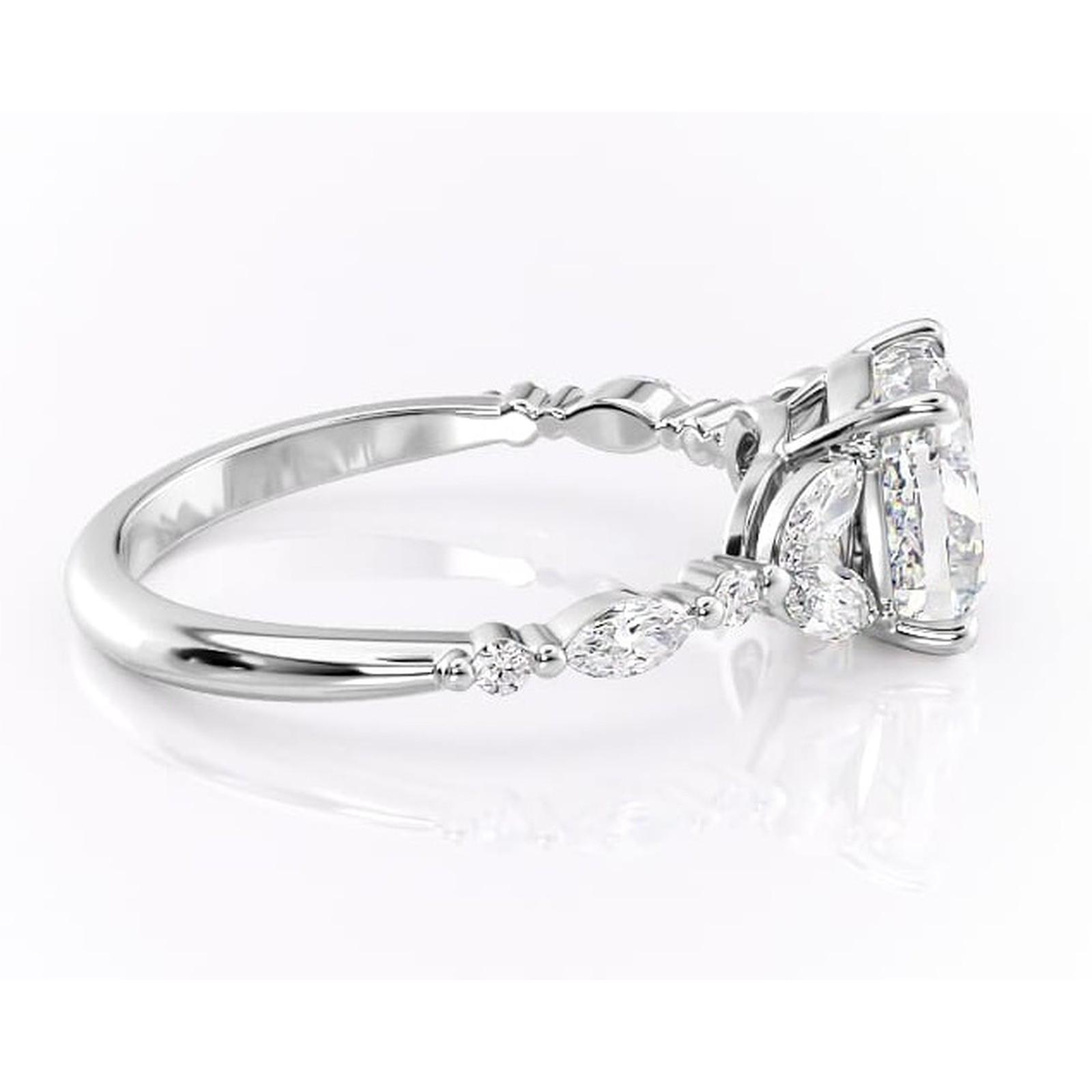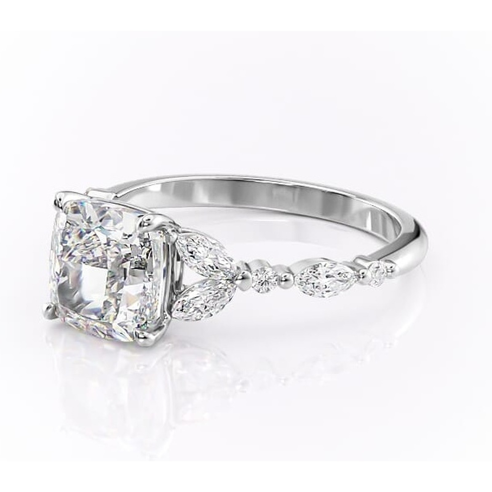 Inel de logodnă Bloom din aur Alb 14kt cu moissanite tăietură pernă – Montură cu trei pietre rafinată pentru profil mediu | Personalizează și configurează gratuit online