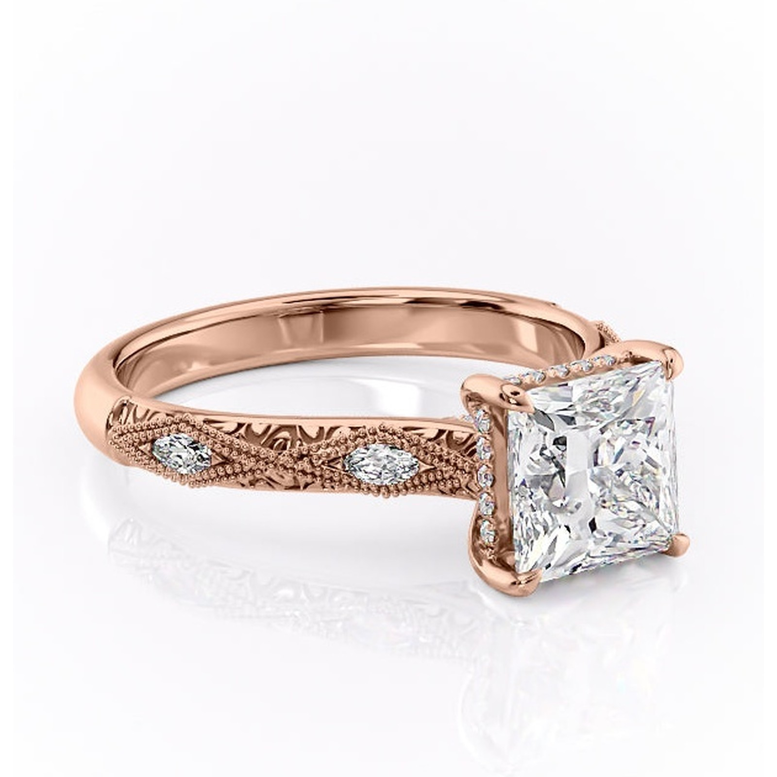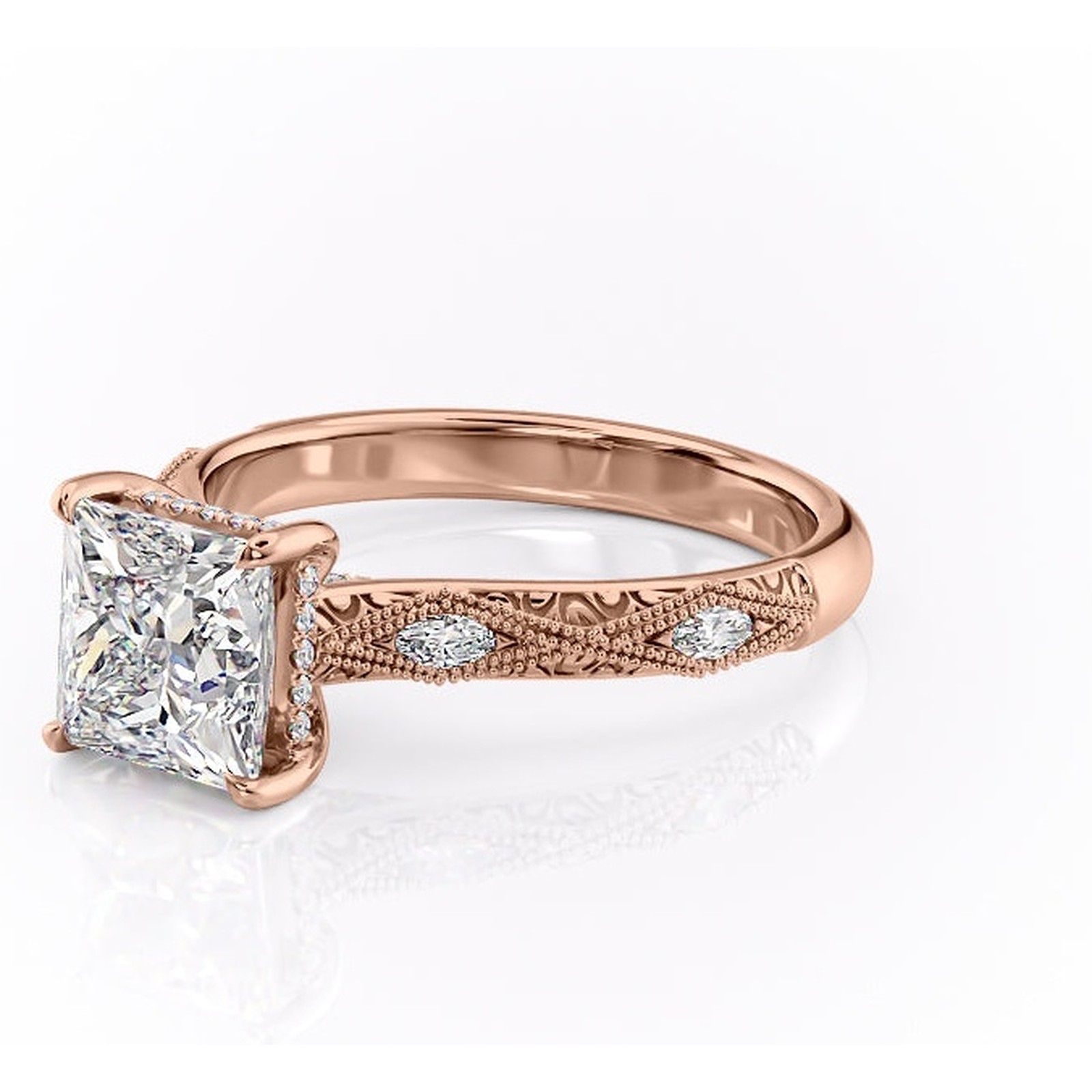Inel de logodnă Vespera din aur Rose 18kt cu moissanite tăietură princess – Pietre laterale rafinată pentru profil înalt | Personalizează și configurează gratuit online